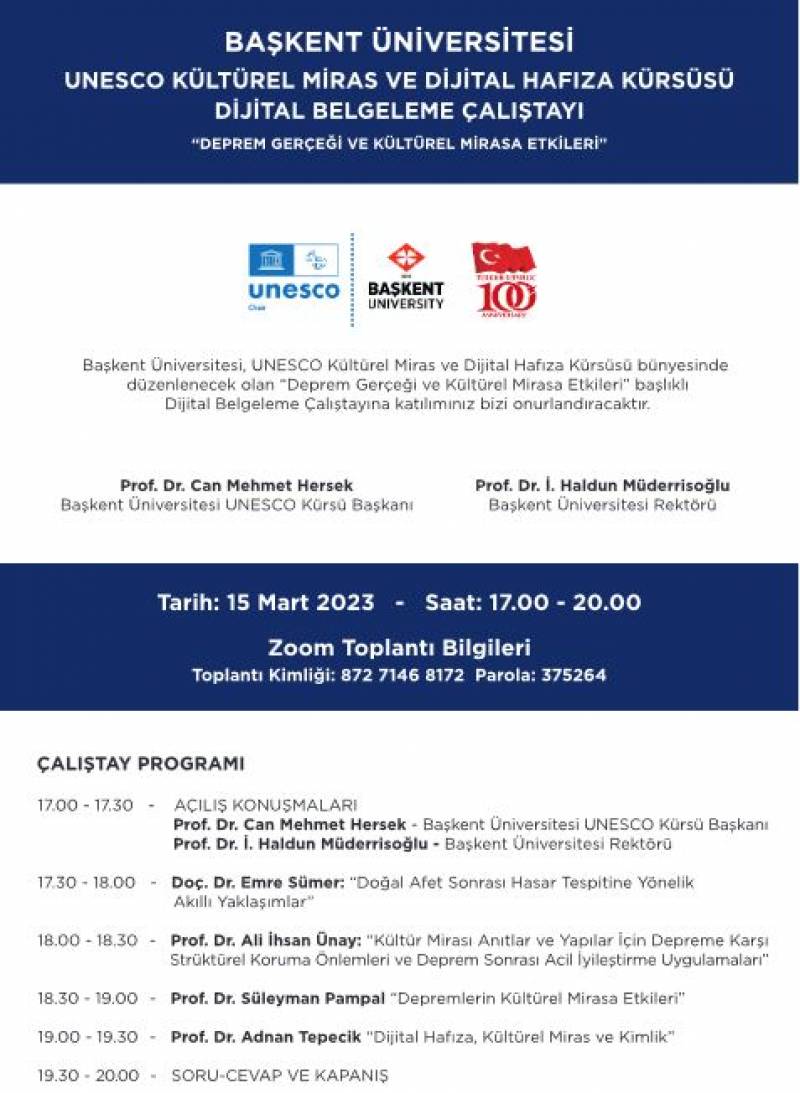 Başkent Üniversitesi, UNESCO Kültürel Miras ve DijitalHafızaKürsüsü bünyesinde düzenlenecek olan "DepremGerçeğive Kültürel Mirasa Etkileri"başlıklıDijital BelgelemeÇalıştayına ait bilgiler ektedir.