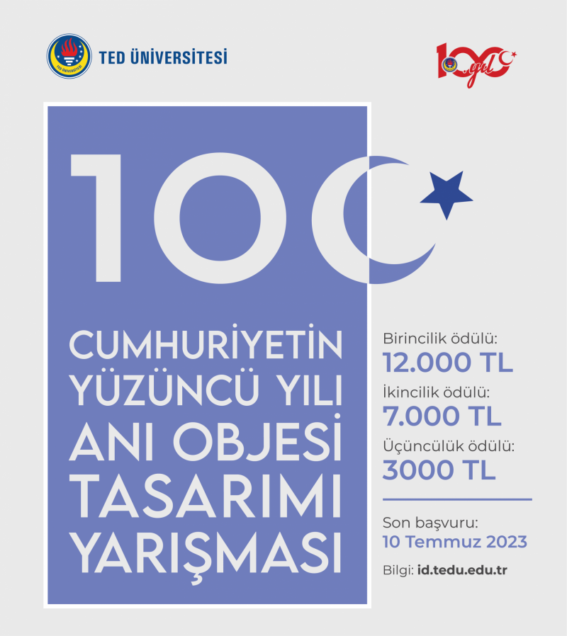 Cumhuriyetimizin yüzüncü yılını kutlayacağımız bu sene içerisinde TED Üniversitesi'nde çeşitli etkinlikler organize edilmektedir. Bu etkinliklerin bir parçası olarak "Yüzüncü Yıl Anı Objesi Tasarımı Öğrenci Yarışması" düzenlenmektedir. Yarışma, Türkiye Cumhuriyetinde öğrenim görmekte olan mimarlık, tasarım ve güzel sanatlar fakültelerinin lisans öğrencilerinin bireysel veya ekip katılımına açıktır. Son katılım tarihi 10 Temmuz 2023 olup, detaylı bilgi ve yarışma şartnamesi id.tedu.edu.tr/yuzuncu-yil-ani-objesi-tasarimi-yarismasi adresinde ilan edilmiştir.