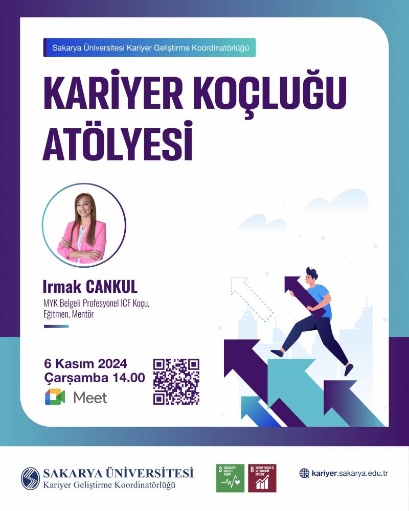 6 Kasım 2024 Çarşamba günü (yarın) saat 14.00'te gerçekleştirilecek olan 'Kariyer Koçluğu Atölyesi' konulu online etkinliği yapılacaktır. Afiş üzerindeki QR kodu okutarak etkinliğe giriş yapılabilir.
