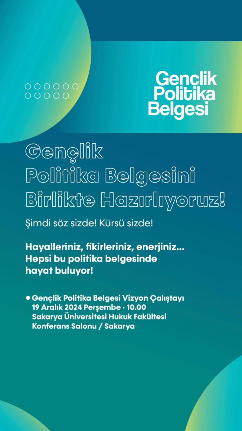 Gençlik Hizmetleri Genel Müdürlüğü'nün 25.11.2024 tarihli ve 9273095 sayılı yazısı gereği Gençlik ve Spor Bakanlığı tarafından araştırma temelli çalışmalara dayanan politikalar, gençlerin gelişimine katkıda bulunacak fırsatları sunarken, toplumun sürdürülebilir kalkınmasına da katkı sağlamayı hedeflemekte ve onları toplumsal yapının güçlü bir parçası haline getirmeyi amaçlayan kapsamlı bir yol haritası sunması doğrultusunda, ülkemiz gençlerine yönelik ulusal politikaların şekillenmesinde gençlerin aktif katılımını sağlamak ve görüşlerini doğrudan politika geliştirme sürecine dahil etmek amacıyla 19 Aralık 2024 Perşembe günü saat 10:00'da Sakarya Üniversitesi Hukuk Fakültesi Konferans Salonunda "Gençlik Politika Belgesi Vizyon Çalıştayları", ardından saat 13:00'da Sakarya Üniversitesi Genç Ofiste 11 politika alanında Atölye Çalışmaları düzenlenecektir.