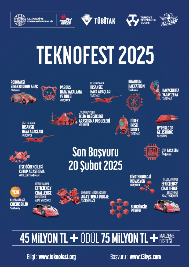 Detaylı bilgi www.teknofest.org sayfasından duyurulmakta, başvurular 20 Şubat 2025 tarihine kadar http://www.t3kys.com sisteminden alınmaktadır.