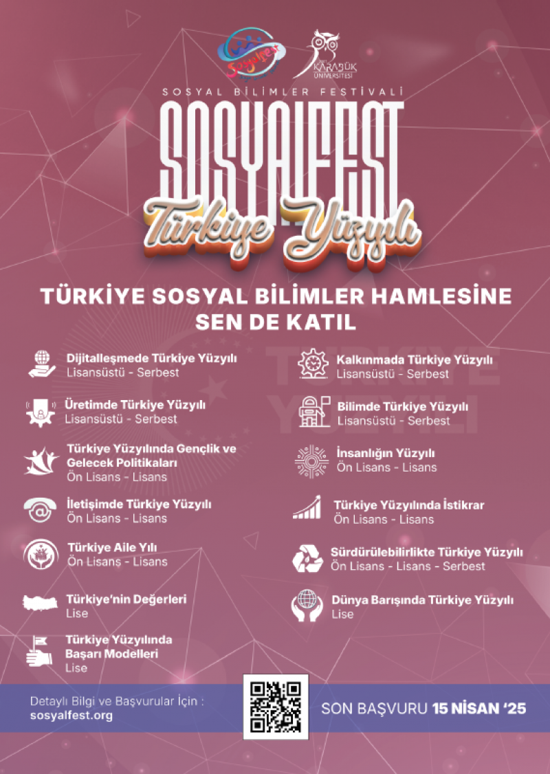 Türkiye'nin ve dünyanın hem günümüz hem de gelecekteki ihtiyaçlarını karşılayacak sosyal modeller üreterek insanların barış ve huzur içerisinde yaşayabileceği bir toplumun inşasına öncülük etmek amacıyla Sosyalfest 2025 gerçekleştirilecektir. Sosyalfest 2025'in Türkiye Yüzyılı, Türk Dünyası, İlahiyat ve Sağlıkfest Özel Kategorisi olmak üzere dört kategori altında şekillenen model tasarım yarışmalarına başvurular 10 Ocak 2025 tarihi itibariyle başlamıştır. Sosyalfest 2025 model tasarım yarışmalarına ait tanıtım görselleri ekte yer almaktadır.