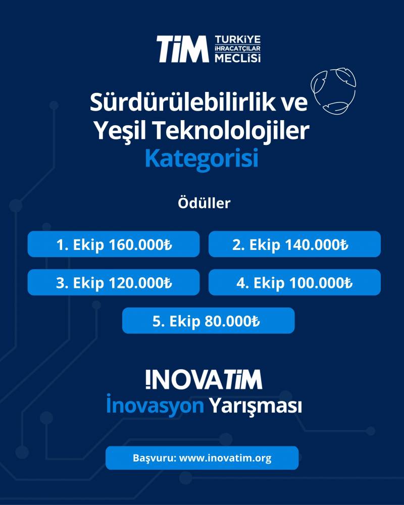 Bu yıl beşincisi düzenlenecek olan İnovaTİM İnovasyon Yarışması; Sürdürülebilirlik ve Yeşil Teknolojiler ve Yapay Zeka kategorilerinde gerçekleştirilecek olup iki kategoride ilk beşegiren toplam 10 proje takımına 1.200.000 TL ödül, Türkiye Innovation Week’te düzenlenecek olan ödül töreninde takdim edilecektir.